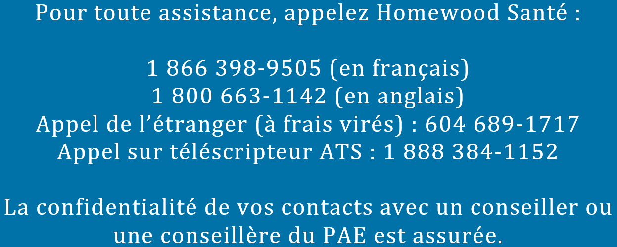 Pour obtenir des informations complètes sur le programme d’aide aux employés, veuillez consulter le site Internet du PAE à l’adresse suivante: https://cspace.concordia.ca/services/hr/sante-mentale-et-bien-etre/pae.html.